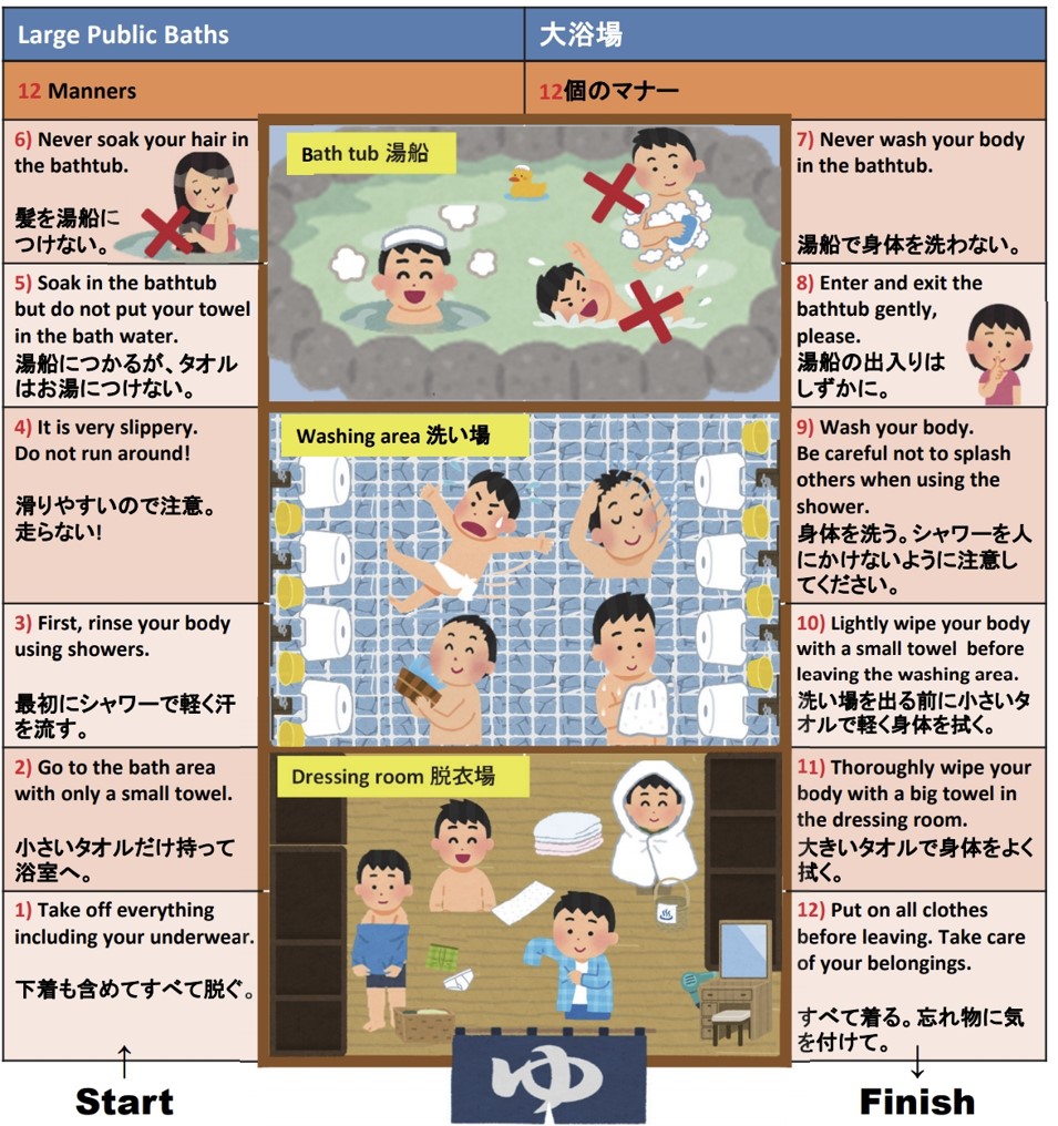 私: 大浴場をご案内します。こちらが男性、ブルーの暖簾(のれん)で、こちらが女性の暖簾です。はいりましょう。靴を脱いでください。