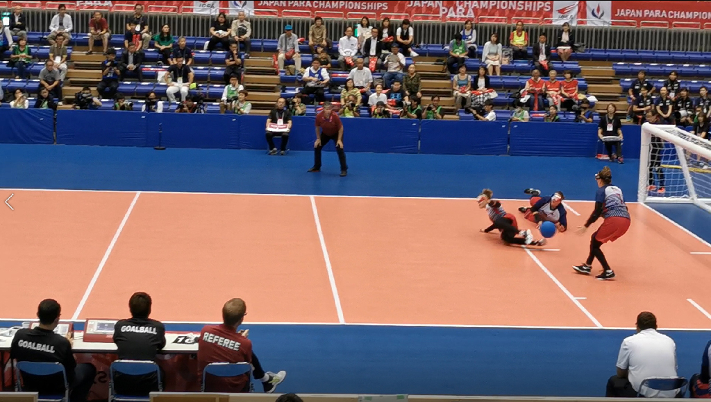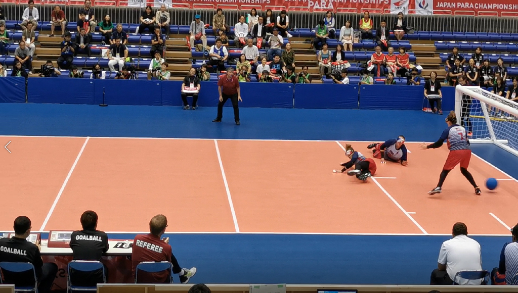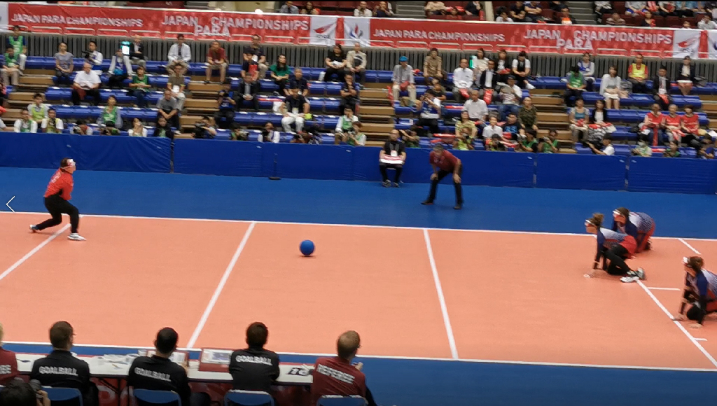 A team ball game for the visually impaired. All players, from blind to low vision, must wear blindfolds in order to ensure a fair competition. The game is played between two teams with three players per team on a volleyball-sized (18m x 9m) court. The aim of the game is to score points by rolling a ball with a bell in it into the opponent's goal. Each game lasts 12 minutes, with extra time (3 minutes each for the first and second halves) played using the 'golden goal' system. The attackers use tactics such as speedballs and bouncing balls, aiming for a course that is difficult to defend, and throwing the ball in such a way as to make as little noise as possible so that the origin of the ball cannot be detected. The defenders can instantly detect the course of the ball by the sound of the bell in the ball, the footsteps of the opponents or the position of the bouncing ball, and then lie down to form a defensive wall to stop the ball. As the players play by sound, spectators are expected to remain quiet. The ball is specially designed for goalball and weighs 1.25 kg. It is expected that spectators watch the game quietly during play.